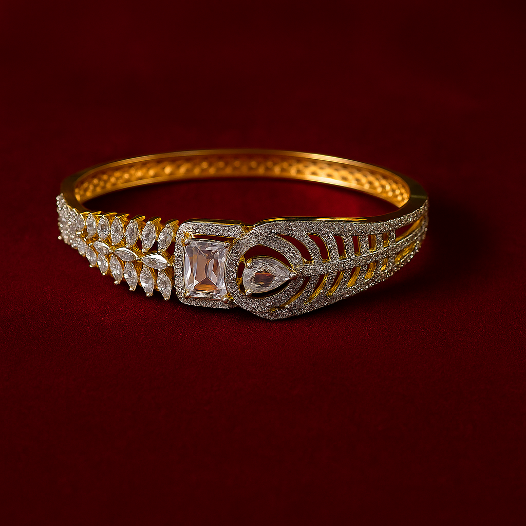 Step into the spotlight with the Crystal Peacock Feather Bangle Bracelet, a symbol of refined elegance and craftsmanship. Featuring a peacock feather-inspired motif adorned with high-shine American diamonds, this bracelet is a statement piece in every sense. A square-cut and teardrop diamond-like crystal take center stage, encased in a rich gold finish, making it perfect for bridal wear, festivities, or luxurious gifting.