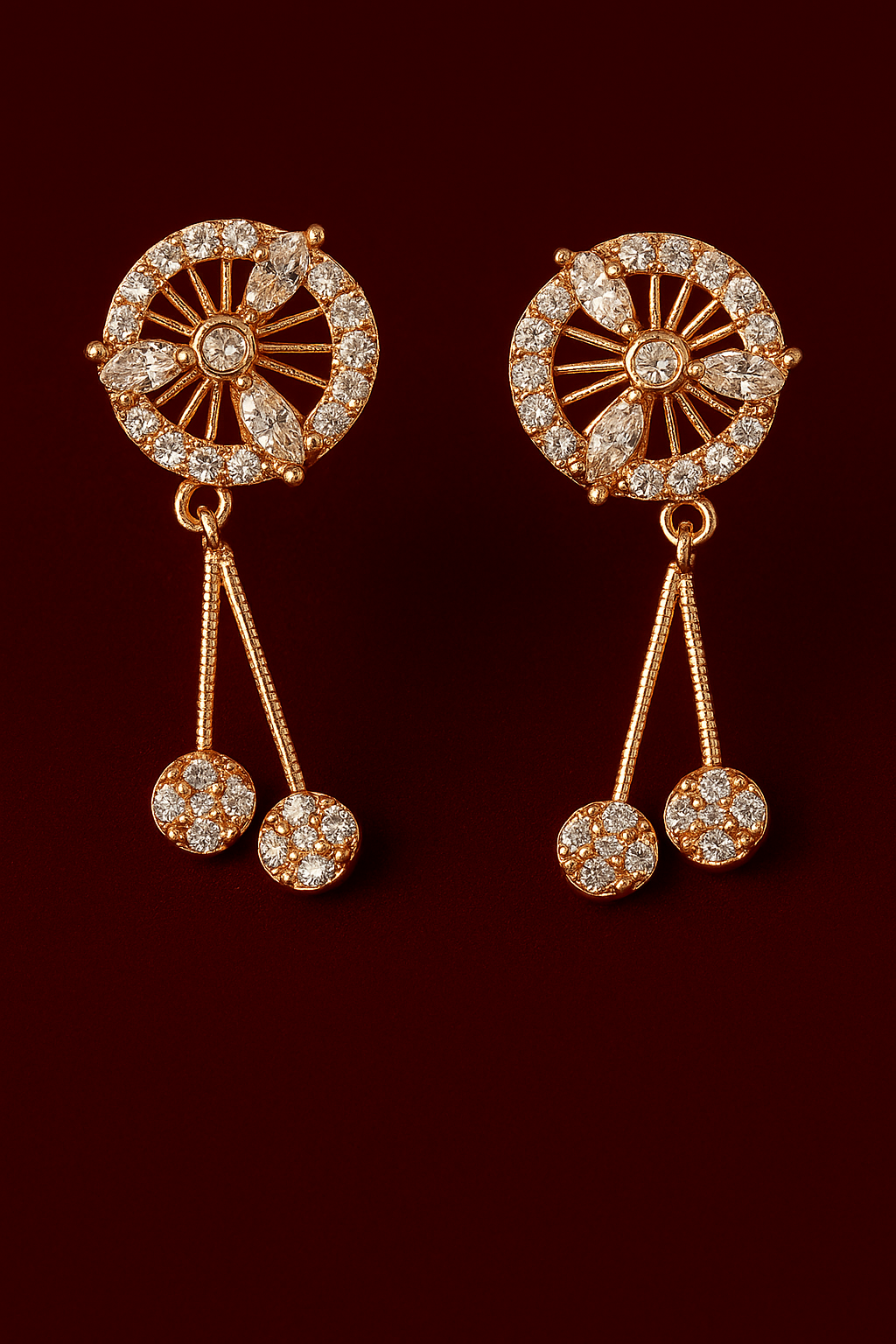 Add a touch of elegance and sparkle to your look with these Rose Gold Radiance CZ Dangle Earrings. Designed in a captivating circular motif with shimmering white cubic zirconia stones, the earrings feature dual dangling round drops that sway beautifully with every movement. The rose gold finish enhances the brilliance of the stones, making them a stunning choice for festive wear, weddings, or special occasions.